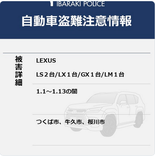 茨城県の話しになりますが、 2026年に入ってから、 すでに5台のLEXUS車が 盗難被害に遭ったとのことです。