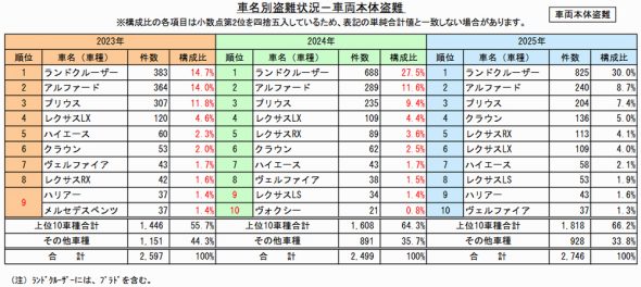 一般社団法人日本損害保険協会さんが、 行った2025年自動車盗難事故実態調査の結果が、 公表されました。